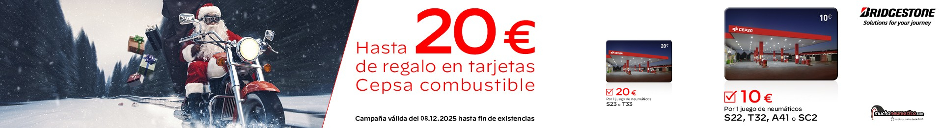 - Por la compra de 2 neumáticos Bridgestone para Moto modelos S22 / T32 / A41 / SC2 el usuario recibirá una tarjeta Cepsa de combustible por el importe de 10€.