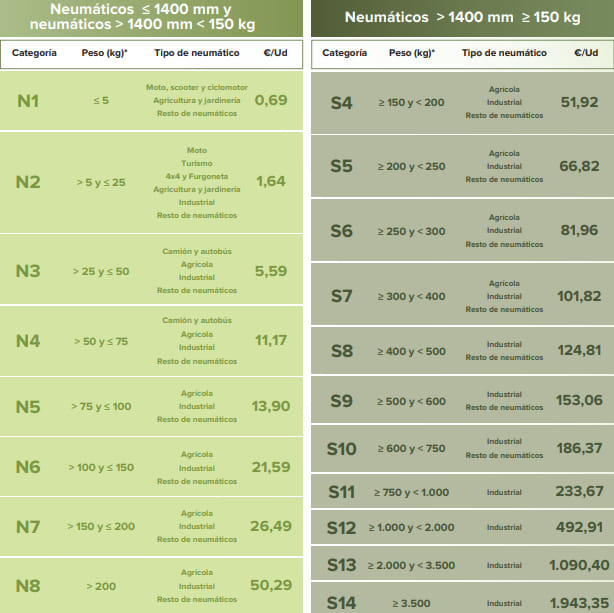 Este importe está fijado por el Sistema Integrado de Gestión (SIG) que se haga cargo y equivale al coste de gestión que suponga el tratamiento del neumático fuera de uso. Estas tarifas variarán en función del modelo de neumático.